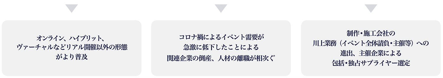 ● ビジネスイベント市場では、オンラインやハイブリッドなど案件形態が多様化することにより 主催企業のニーズが分散する一方で、人手不足もあってニーズに充分に対応することが難しくなっています。