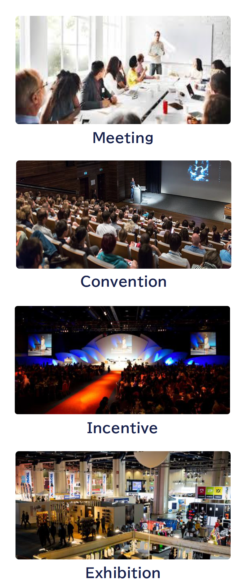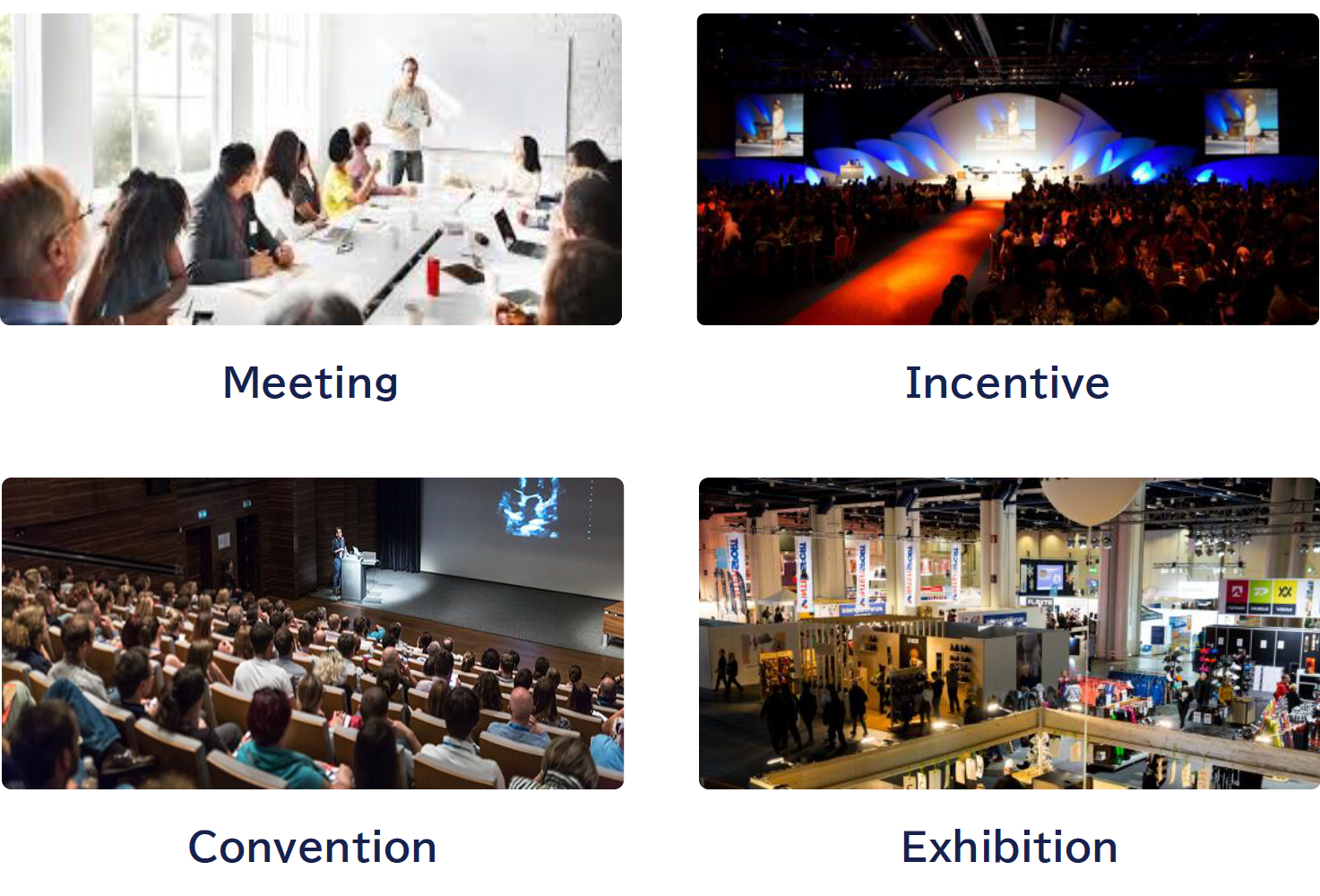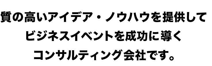 ビジネスイベントはMICEという括りで呼ばれることもあります。 ※MICE(マイス)とは、Meeting(企業などによる会議・研修)、Incentive Travel(企業などによる研修・招待旅行)、ConventionあるいはConference(国際機関・団体・学会などによる国際会議)、ExhibitionまたはEvent(展示会・見本市・イベント)の頭文字をとった造語。 当社は、ビジネスイベントを事業ドメインとして、様々なソリューションを提供しております。